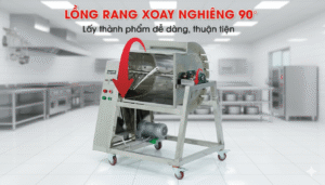 Lồng có cơ cấu nghiêng/xả giúp đổ ruốc ra nhanh, hạn chế rơi vãi. Toàn bộ thân máy bằng inox chống gỉ, dễ lau chùi sau mỗi mẻ, phù hợp yêu cầu vệ sinh an toàn thực phẩm.