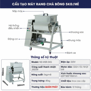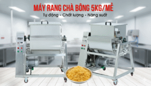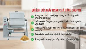 Thiết bị vận hành tự động, giúp rang nhanh, đảo đều, hạn chế vón cục, giảm hao hụt so với rang thủ công bằng chảo/nồi. Với quy mô 5kg/mẻ, máy đặc biệt phù hợp cho cơ sở làm chà bông, cơm cháy chà bông, bếp ăn, nhà hàng, xưởng thực phẩm quy mô vừa và nhỏ.