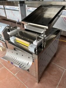 Trứng sạch được đẩy ra khay chứa, còn vỏ được xả riêng xuống đáy, đảm bảo quy trình liên tục – nhanh – sạch.