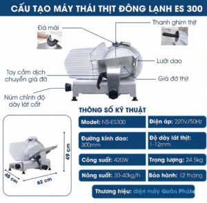 Máy thái thịt đông lạnh ES300 tại Điện máy Quân Phát là dòng máy đa năng, chuyên dùng cho nhà hàng, quán lẩu nướng, quán phở, bếp ăn công nghiệp… Máy thái tốt thịt đông se lạnh, thịt chín, giò chả, phô mai, dăm bông và một số loại rau củ (măng, củ sen, cà rốt, khoai tây…).
