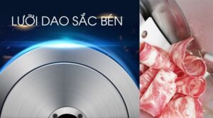 Lưỡi dao tròn đường kính 300mm, thép cứng sắc bén, bào thịt nhanh, lát cắt mỏng đẹp, không bị vụn. Có đá mài tích hợp trên máy giúp mài sắc lưỡi dao dễ dàng.