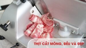 Vận hành bán tự động, thao tác đơn giản: cố định khối thịt, bật máy, chỉnh độ dày và đẩy thịt là đã có ngay những lát thịt mỏng, đều, cuộn đẹp.